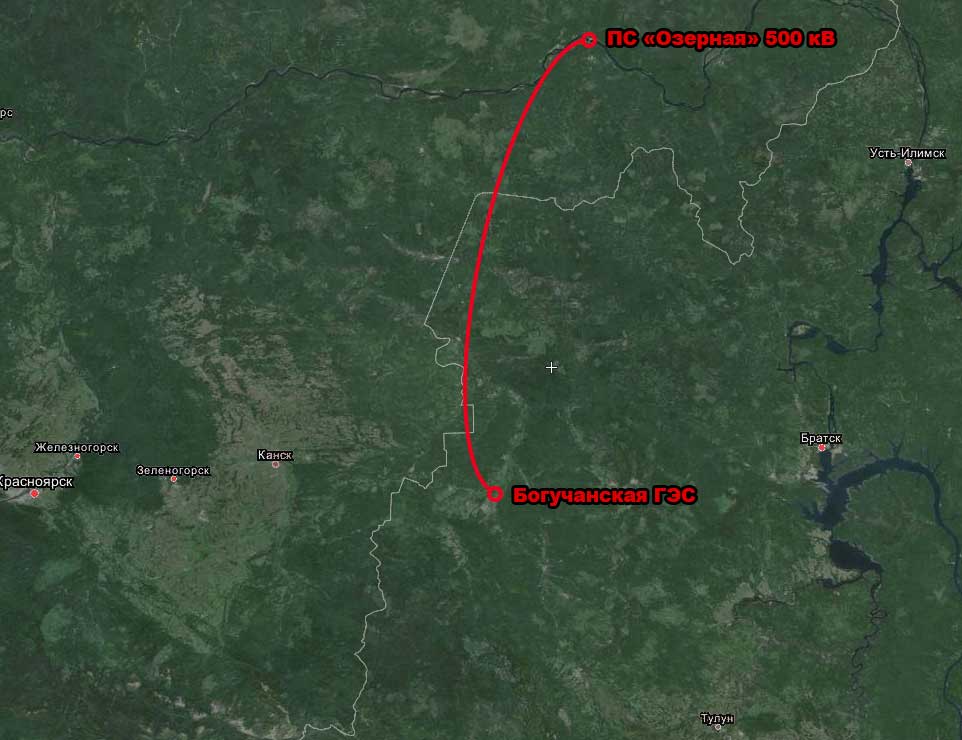 Богучанская ГЭС — ПС «Озерная» ВЛ 500 кВ построена для обеспечении мощности Богучанской ГЭС и электроснабжения Тайшетского алюминиевого завода. Высоковольтная линия проходит по 3 территориям: Тайшетский район Иркутская область (219,3 км), Богучанский район Красноярский край (106 км), Кежемский район Красноярский край (4,6 км).