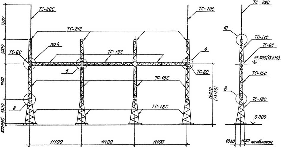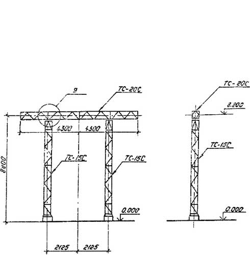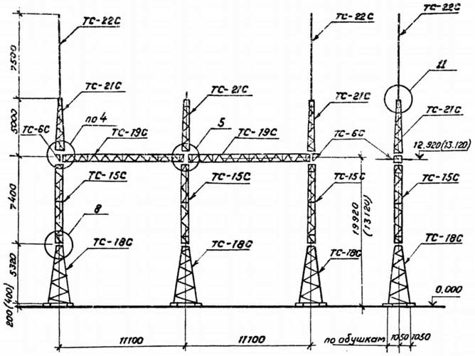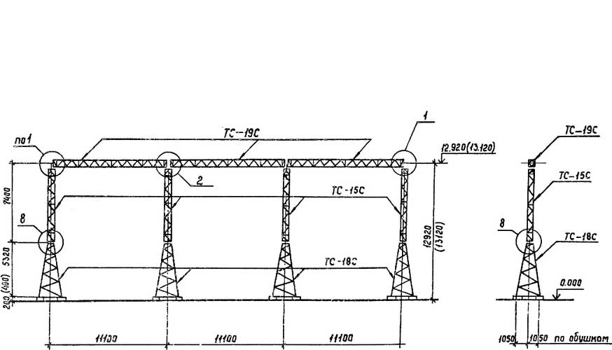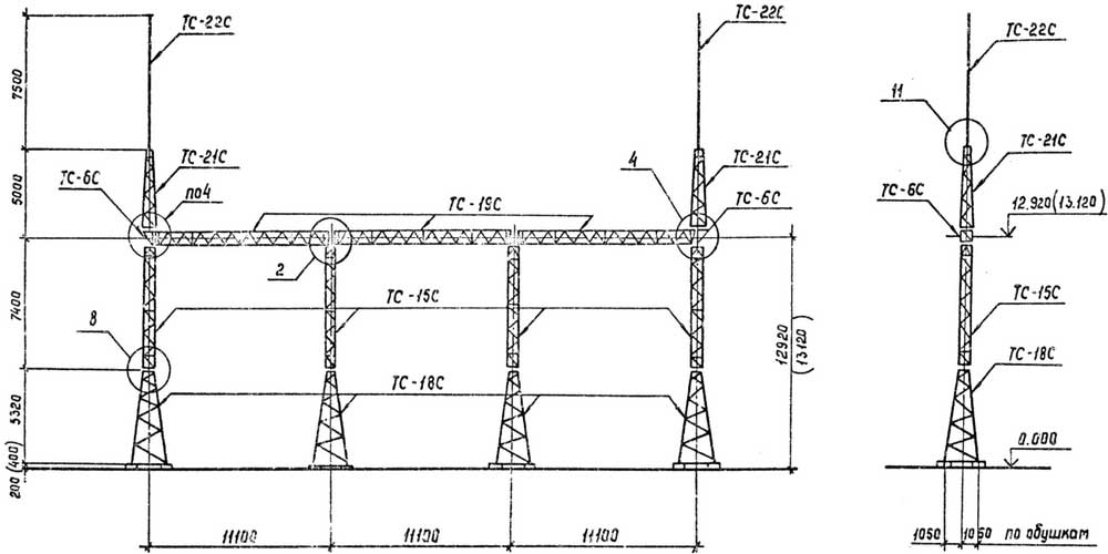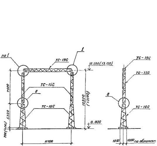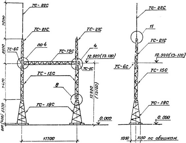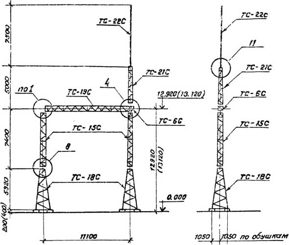 Изготавливаются по типовому проекту 3.407.2-162 выпуск 1, 2. Траверса и стойки производятся из углового металлопроката в виде сварных решетчатых конструкций с поперечным сечением 500 х 500 мм.