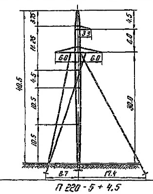 Цены на опоры П220-5+4,5 в Алма-ате могут различаться, в зависимости от марки стали металлоконструкций и антикоррозийного покрытия. Вес опоры П220-5+4,5 без антикоррозийного покрытия 3731 кг, с покрытием методом горячего цинкования 3852 кг. Марка троса С70 (ТК-11), марка проводов АС 240/32 — АС 400/51. Опоры П220-5+4,5 производятся по типовому проекту 3.407-114 (9226тм-т2), по цепности — одноцепные, по типу промежуточные. Все металлические опоры комплектуются оцинкованными метизами.