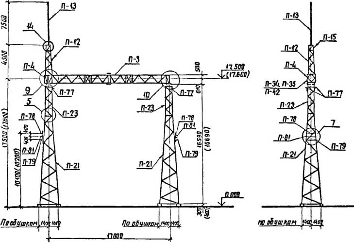 Стальной перемычечный портал ОРУ 500 кВ ПС-500П1 изготавливается по типовому проекту 3.407.9-149 выпуск 2. Траверса и стойки (узкобазные) производятся из углового металлопроката в виде болтового соединения решетчатых конструкций.