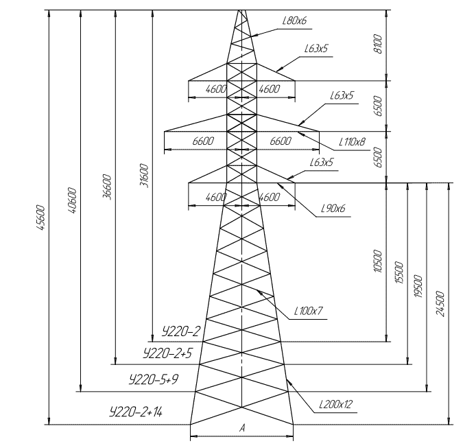 Цены на опоры У220-2+5 в Алма-ате могут различаться, в зависимости от марки стали металлоконструкций и антикоррозийного покрытия. По типу опора У220-2+5 — анкерно-угловая, по цепности — двухцепная. База опоры 6700 мм. Данная опора способна выдержать скоростной напор ветра 50 кгс/м2. Марка стали С245, С345 ГOCT27772-88, RST37 52, DIN17100-80 ФРГ, марка троса TK-11,0. Марка проводов АС 300/39 — АС 400/51, район по гололеду I-IV. Вес опоры без антикоррозийного покрытия 17603 кг, вес опоры У220-2+5 с горячим цинковым покрытием 18290 кг. Болты класса прочности 4,6.